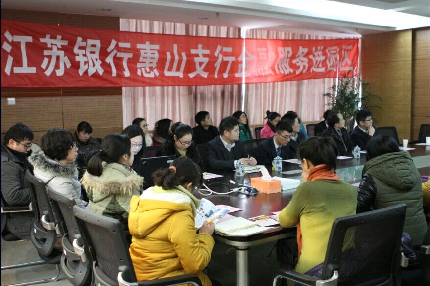2014年12月26日,園區舉辦了以“江蘇銀行惠山支行金融服務進園區”為主題的交流會,邀請了江蘇銀行惠山支行貸款部門相關業務人員來園區講座,江蘇銀行分行貸款部主任徐研、園區孵化器副總經理陳國棟、園區財務總監顧仁娣出席會議,園區近20家企業、約50人參與活動。