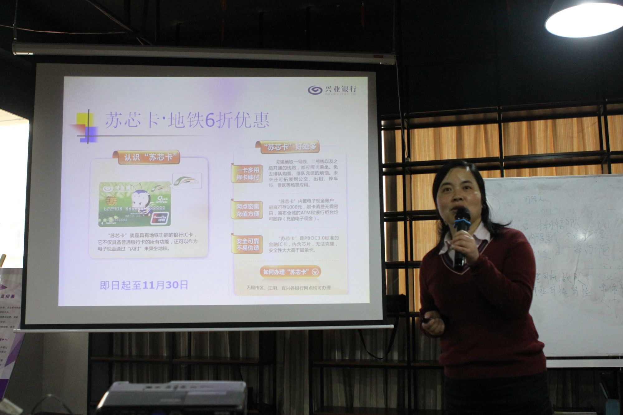 首先,興業(yè)銀行惠山支行榮經(jīng)理為園區(qū)企業(yè)介紹興業(yè)銀行的各項金融產(chǎn)品,針對銀行借記卡和貸記卡的各種優(yōu)惠進行了詳細介紹。
