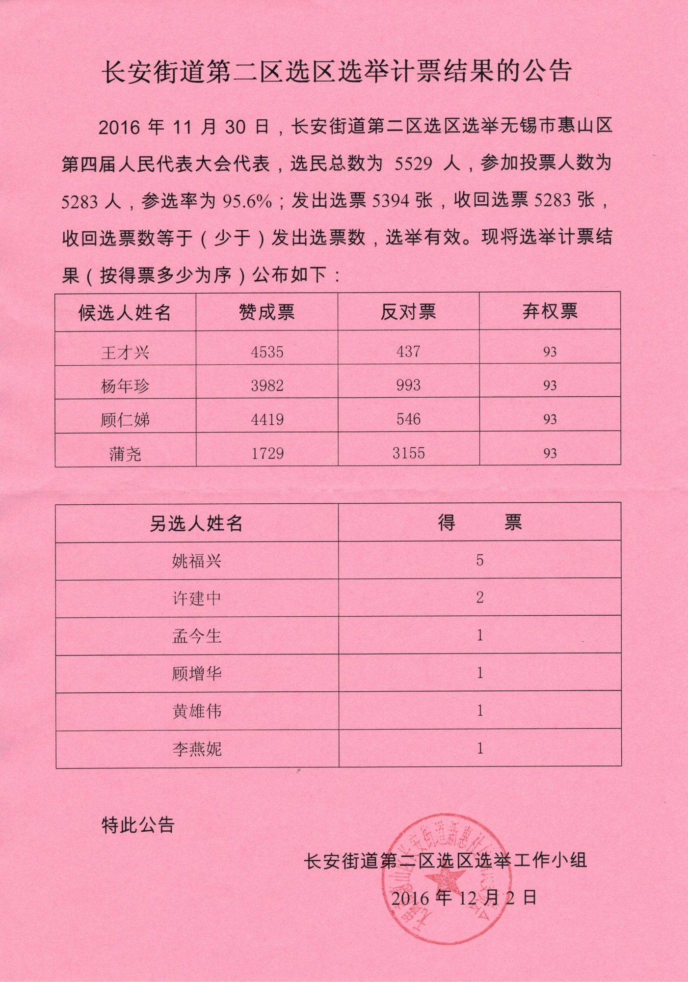 惠山區(qū)、鎮(zhèn)兩級第四屆人民代表大會代表長安街道第二區(qū)選區(qū)計票結(jié)果新鮮出爐啦!