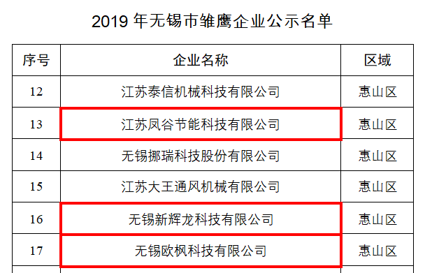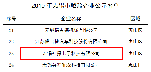 近日,無錫市科技局公布了三類企業(雛鷹、瞪羚、獨角獸企業)2019年度遴選結果公示名單,江蘇數字信息產業園入園企業江蘇鳳谷節能科技有限公司、無錫新輝龍科技有限公司、無錫歐楓科技有限公司3家企業成功入選雛鷹企業;無錫神探電子科技有限公司成功入選瞪羚企業,目前名單正在公示中。