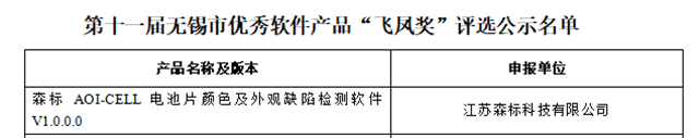根據《市政府關于印發無錫市優秀軟件產品“飛鳳獎”申報評選辦法的通知》(錫政發〔2015〕52號)文件精神,市工業和信息化局組織開展了第十一屆無錫市優秀軟件產品“飛鳳獎”的評選工作。在企業申報及市(縣)、區產業主管部門推薦的基礎上,經初審、復審、銷售審計、質量評測和專家評審,江蘇森標科技有限公司的“森標 AOI-CELL 電池片顏色及外觀缺陷檢測軟件V1.0.0.0 ”軟件產品成功入圍第十一屆無錫市優秀軟件產品“飛鳳獎”,此次入圍的軟件產品共10個。