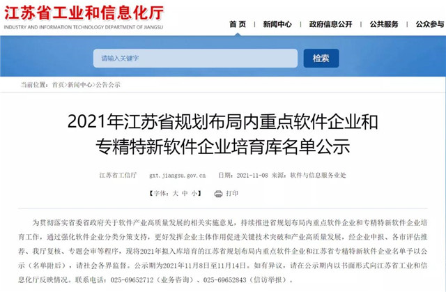 近日,江蘇省工信廳公示了2021年江蘇省規劃布局內重點軟件企業和專精特新軟件企業培育庫名單,數字園企業江蘇森標科技有限公司和無錫神探電子科技有限公司成功入圍2021年江蘇省專精特新軟件企業培育庫。