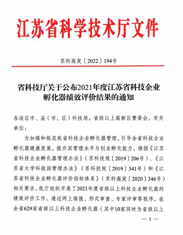 喜訊|無錫力合科技孵化器榮獲2021年度江蘇省科技企業孵化器績效評價A類