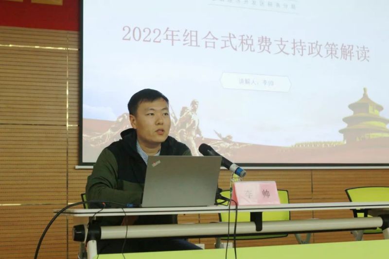 開發區稅務分局基礎組組長李帥講解了2022年組合式稅費支持政策:包括增值稅免稅、加計抵減、留抵退稅、緩繳;小微企業的企業所得稅優惠稅率、費用扣除相關類;小微企業“六稅兩費”減免政策等。