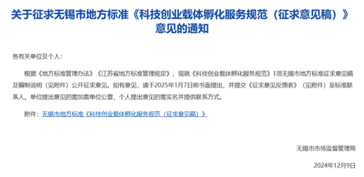 ??2024年12月9日,無錫市市場監(jiān)督管理局發(fā)布了由無錫力合科技孵化器牽頭起草的“關于征求無錫市地方標準《科技創(chuàng)業(yè)載體孵化服務規(guī)范(征求意見稿)》的通知”,并廣泛征求意見。