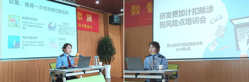 2025年4月10日下午,園區特邀惠山經濟技術開發區稅務分局、第二稅務分局聯合開展稅務專題宣傳,為入園企業的財稅人員提供針對性涉稅輔導。此次培訓會由青年業務骨干王慧敏、王立彬來園區主講,園區多家企業財稅人員積極參會。
