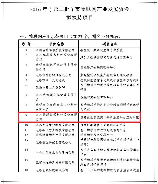 恭喜江蘇慧眼數(shù)據(jù)科技股份有限公司 獲評(píng)2016年(第二批)市物聯(lián)網(wǎng)產(chǎn)業(yè)發(fā)展資金扶持項(xiàng)目